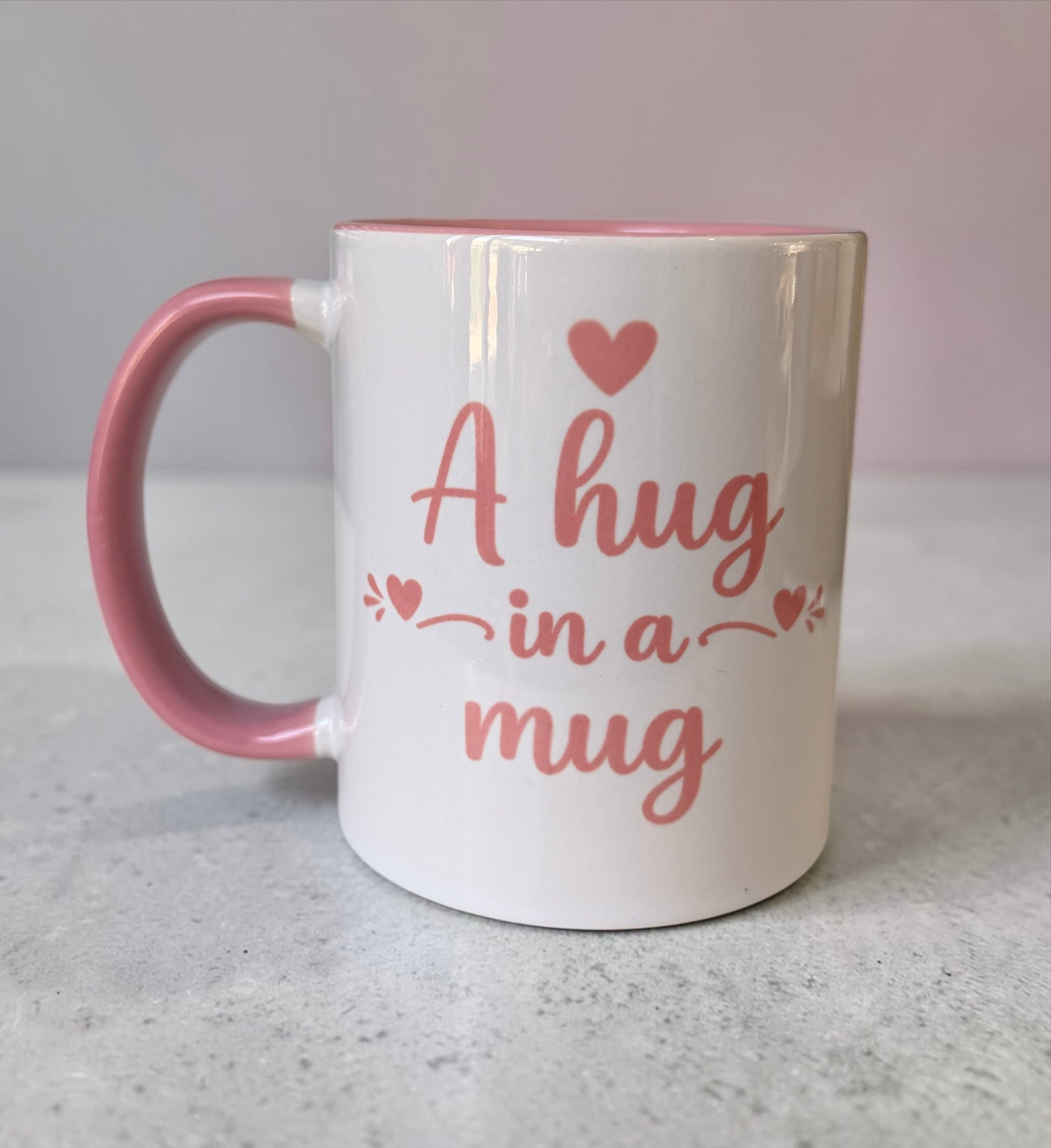 Send a little comfort with every sip with our A Hug in a Mug. This adorable ceramic mug features a soft pink handle and matching pink interior, adding a sweet, cosy touch to their daily routine.