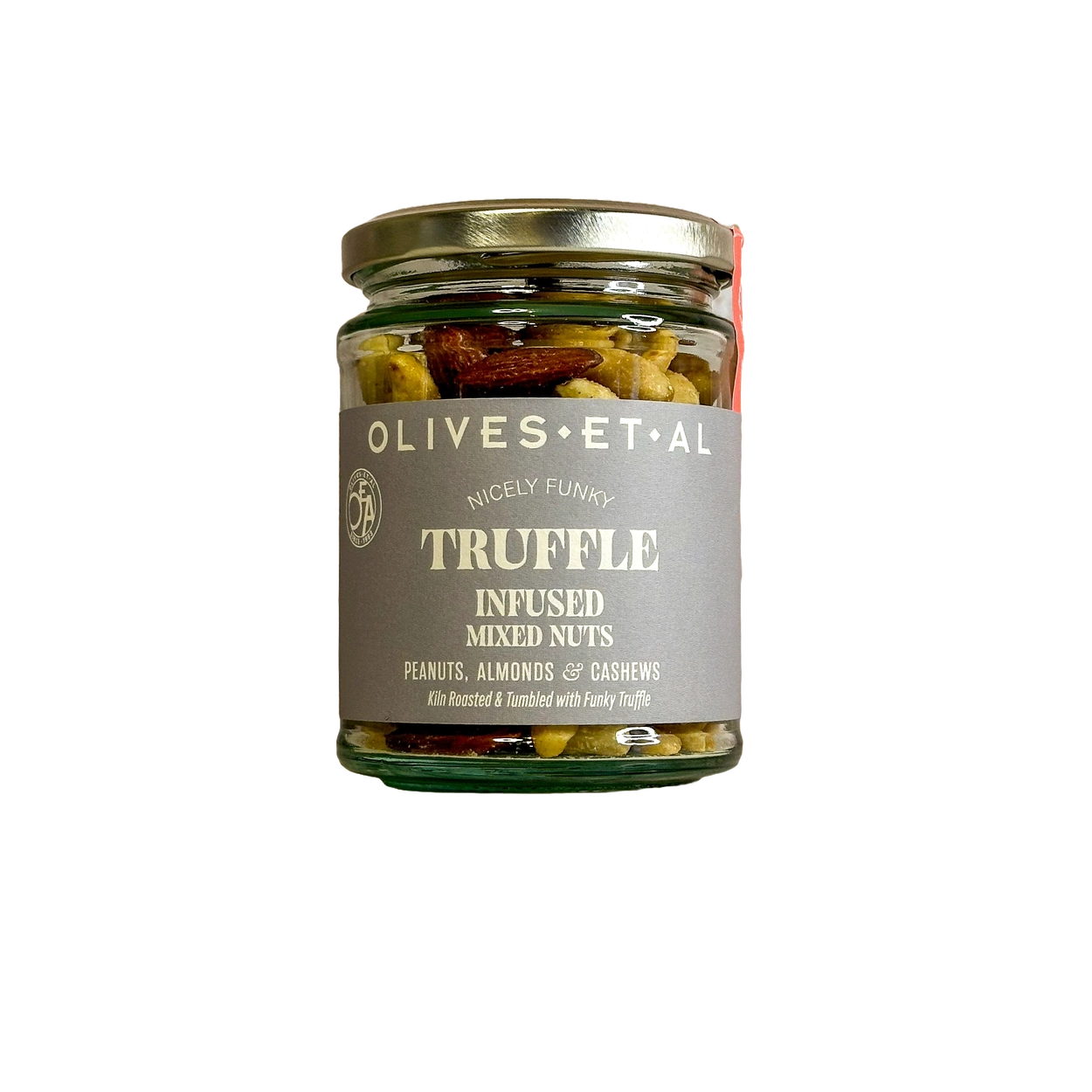 Indulge in our expertly crafted selection of premium roasted nuts, where kiln-roasted peanuts, cashews, and almonds are elevated with an exquisite truffle salt seasoning. This sophisticated blend delivers an earthy, umami-rich flavour that transforms any occasion. Naturally gluten-free and vegan, these nuts make an ideal accompaniment to fine wines, spirits, or simply as a refined snack. Each bite combines the satisfying crunch of quality nuts with the distinctive depth of truffle, creating a truly luxurious tasting experience.