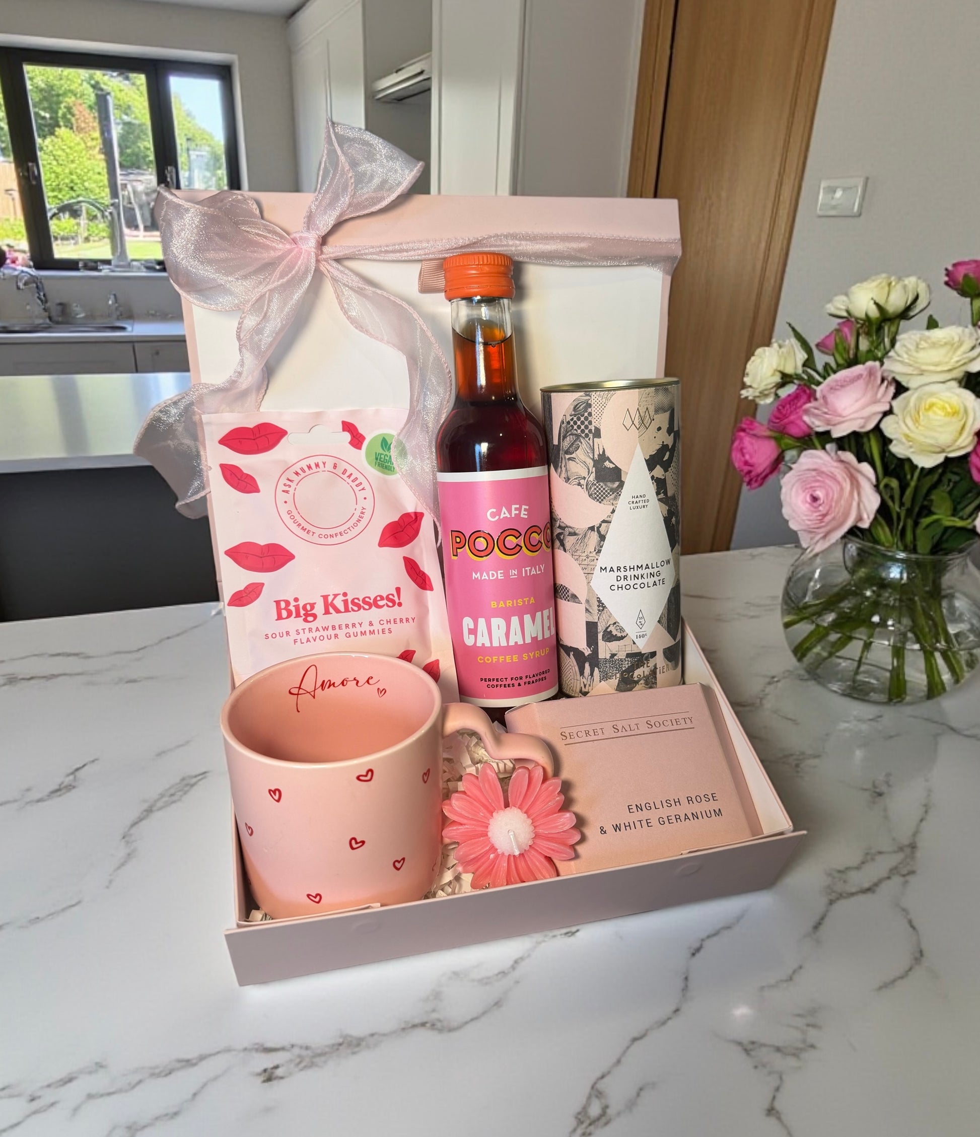 Celebrate love with this thoughtful vegan sweet treat collection. Indulge in sour strawberry and cherry gummies, luxurious vegan marshmallow hot chocolate, and smooth caramel barista syrup for elevated beverages. Sip from a charming heart-printed mug whilst enjoying the gentle ambiance of a daisy-scented candle. Complete your self-care ritual with aromatic bath salts. Perfect for treating yourself or sharing with someone special.